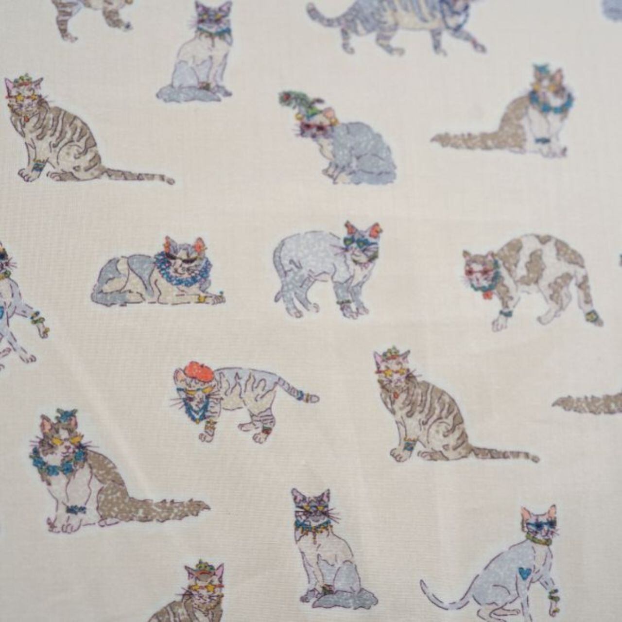 やわらかなアイボリー地に、さまざまなポーズを取る猫たちが繊細なタッチで描かれたプリント生地です。