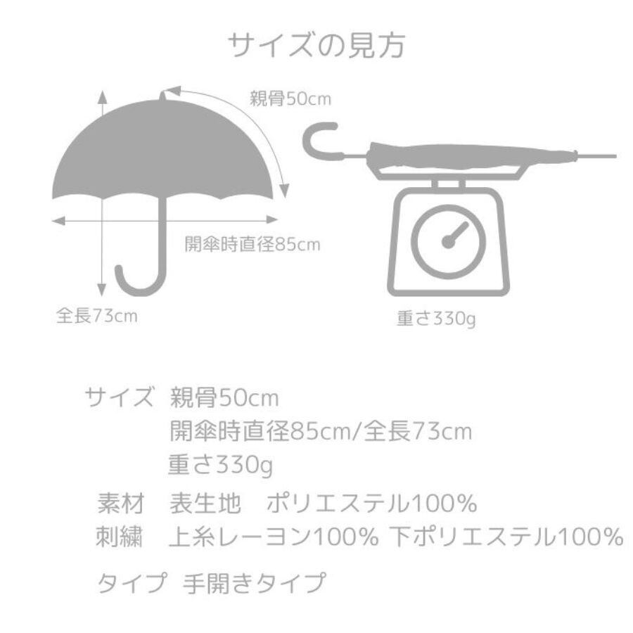 サイズ 親骨50cm/開傘時直径85cm 全長73cm/重さ330g